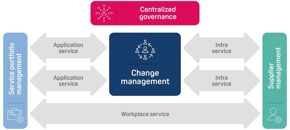 - Supplier management: Shared supplier management is necessary to ensure control of the suppliers involved remains optimal and the scale advantage of the entire organization can be fully exploited. Centralized procurement and managed usage also provide benefits in the case of cloud usage.